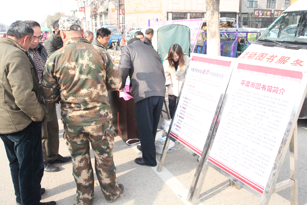 11月20日上午,市图书馆流动服务进基层活动来到了南村镇驻地的大街上。工作人员将流动服务车上的桌椅、图书、宣传刊板等一一摆好,并通过录音广播向大家介绍平度市图书馆及其服务项目,现场办理借书证,现场开展图书借阅,现场发放《平度市图书馆简介》、《平度市图书馆免费开放项目》等宣传页,并给群众免费发放了部分种植养殖、养生保健等方面的适用图书,深受群众欢迎,许多群众是通过了今天的活动,才知道了图书馆,了解了图书馆。