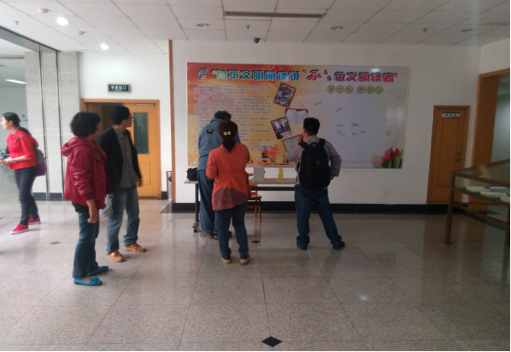 2016年青岛市图书馆“向不文明阅读说不,做文明读者”签名活动于五月一日上午十点正式启动,签名现场位于市图书馆三楼外借一东侧。两个小时的签名活动就有70余名读者自愿签名,明确抵制不文明阅读。