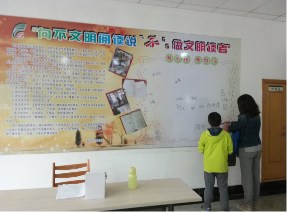 在活动现场,不少读者被“不文明行为”的展柜吸引,不觉驻足观看,还有一些读者停下脚步在“向不文明阅读说不”的宣传牌前认真仔细的阅读“倡议书”。看到展柜里的不文明阅读图片和被乱撕乱画等图书实物很多读者连连摇头,唏嘘不已,并提出严厉的谴责与批评,同时对活动的开展表示支持与赞成;有的义愤填膺,发出由衷的感叹“太不像话了”;有的家长带着孩子来借书,特意让孩子阅读倡议书并鼓励孩子签字争当文明读者。