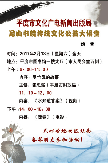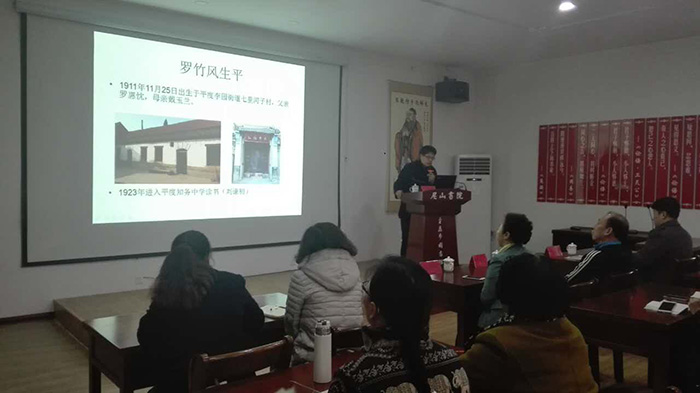 2月18日上午,平度市文化广电新闻出版局尼山书院传统文化公益大讲堂在市图书馆一楼大厅举办,平度市财政局张忠强讲授《罗竹风的故事》,市政协副主席刘明娟,市文广新局党委书记、局长刘成爱和文化系统部分干部职工、图书馆部分读者及部分市民共100余人参加了此次讲座。罗竹风(1911.11~1996.11.04),男,平度市原蟠桃镇七里河子村人。中共党员,上海市第七、八届人大代表、常委。中国著名语言学家,宗教学家,出版家,辞书编纂家,杂文家。张忠强老师用生动形象的语言,为大家详细介绍了平度名人——罗竹风光辉灿烂的一生,许多参加讲座的市民表示,听了本次讲座,才真正了解了罗竹风,他是平度人民的骄傲。