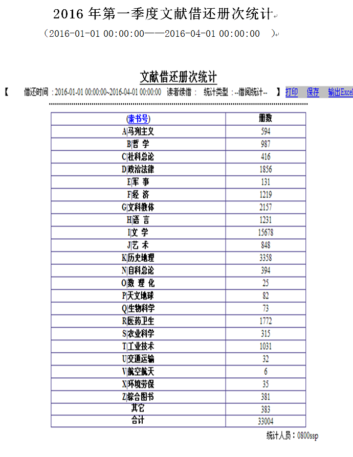 2016年第一季度文献借还册次统计