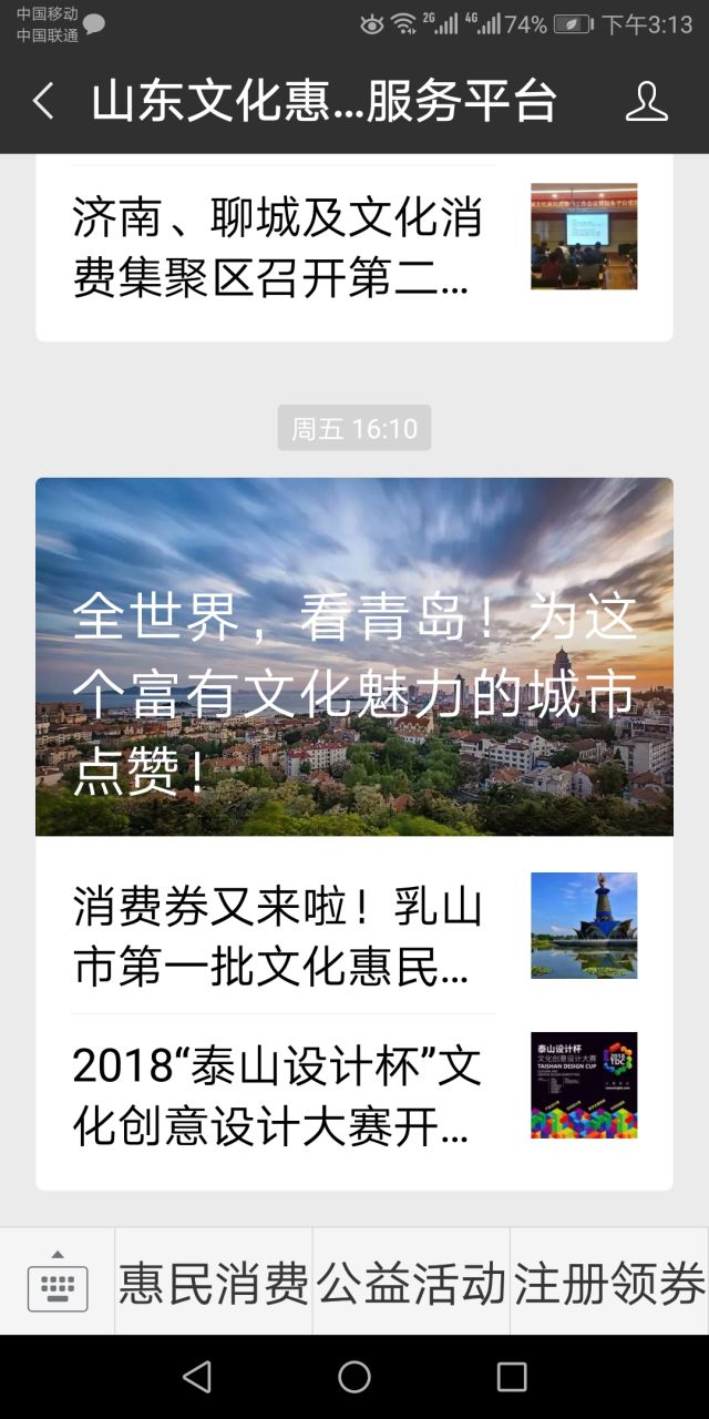 1、市民只需关注“山东文化惠民消费季官方服务号”微信公众号,实名注册后点开下方的“公益活动”,即可出现文乐汇,在的地区选择输入青岛平度市即可了解我市最新的文化公益活动。选择自己喜欢的活动报名参加即可。