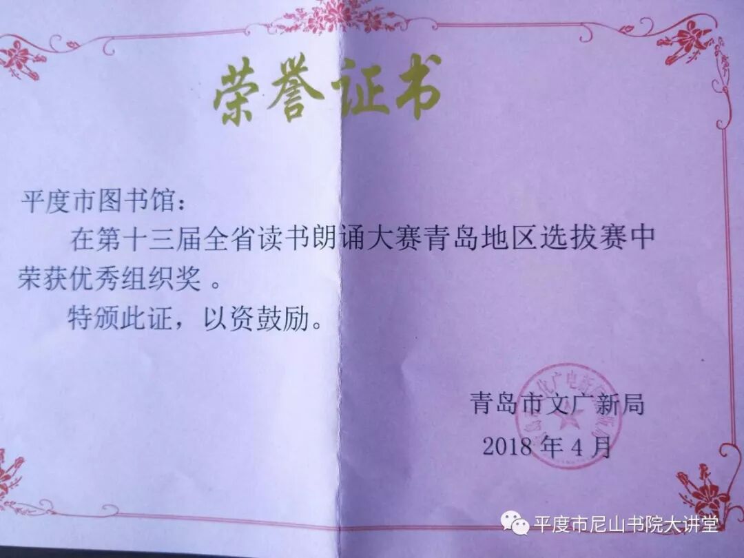 在4月份,第十三届山东省读书朗诵大赛青岛地区选拔赛中,平度市图书馆获得优秀组织奖,刘晓夏获得优秀奖。6月份,经青岛市文广新局推送,王忠友获得山东省2017年度古籍保护先进个人。在7月10举办的以《公共图书馆法》为主的知识竞赛中,张显霞获得第二名一等奖,平度图书馆团队获得第四名三等奖。